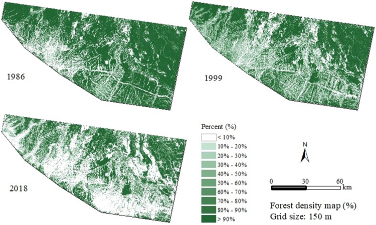 該論文以玻利維亞查帕雷地區(qū)(Chapare region of Bolivia) 為研究區(qū)域,通過自主開發(fā)的子空間方法對該地區(qū)1986年,1999年以及2018年三期Landsat衛(wèi)星數(shù)據(jù)進(jìn)行土地覆被分類,并使用網(wǎng)格單元方法來提取地物變化信息,以此來揭示古柯種植引起的森林砍伐的軌跡以及該地區(qū)主要土地覆被類型之間的時(shí)空變化關(guān)系。該研究豐富和擴(kuò)展了土地覆被分類及變化檢測的技術(shù)方法,對促進(jìn)森林的監(jiān)測保護(hù)及農(nóng)業(yè)可持續(xù)發(fā)展具有一定的實(shí)踐意義。