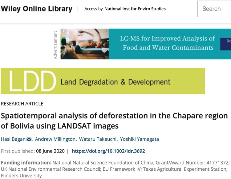 6月8日環(huán)境領(lǐng)域國際權(quán)威期刊Land Degradation & Development(中科院環(huán)境科學(xué)與土壤科學(xué)類一區(qū)Top期刊,3年平均影響因子7.111)在線發(fā)表了環(huán)境與地理科學(xué)學(xué)院城市發(fā)展研究院哈斯巴干研究員的研究論文“Spatio-temporal analysis of deforestation in the Chapare region of Bolivia using Landsat images” (https://onlinelibrary.wiley.com/doi/abs/10.1002/ldr.3692)。