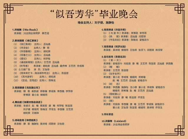 《似吾芳華》晚會是播音與主持藝術(shù)專業(yè)2020級的畢業(yè)匯報演出,演出包含新聞播報、情景朗誦、舞臺劇、詩詞走秀和音樂劇場等精彩紛呈的節(jié)目內(nèi)容.