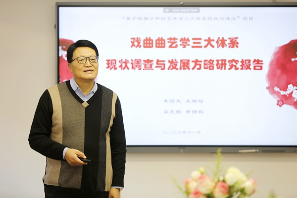 “基于數據分析的藝術學研究三大體系現狀與建設研究”子課題“戲曲曲藝學三大體系現狀與建設調查研究”負責人、上海師范大學學術委員會主任朱恒夫教授向領導與專家組匯報了子課題的調研過程和《戲曲曲藝學三大體系現狀與建設調研報告》的主要內容。邱邑洪主任與專家組聽取了匯報之后,一致認為,該報告的內容基于對海量的相關數據分析,正確、全面地描繪了戲曲曲藝學在學科體系、學術體系、話語體系建設上的成績與不足,對于如何構建和完善戲曲曲藝學的三大體系,提出了可行性很強的具體建議,對于戲曲曲藝學的未來發展具有指導性意義。