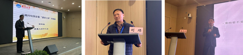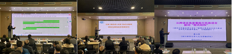 12月3日上午,繼續進行大會報告。第三場大會報告由上海師范大學劉紅妮教授、上海外國語大學邵洪亮教授主持,上海師范大學張誼生教授、復旦大學盧英順教授、復旦大學吳劍鋒教授分別就關聯連詞后附語氣詞、“打賭”類動詞所構成的句式以及漢語施為句式作主旨演講。