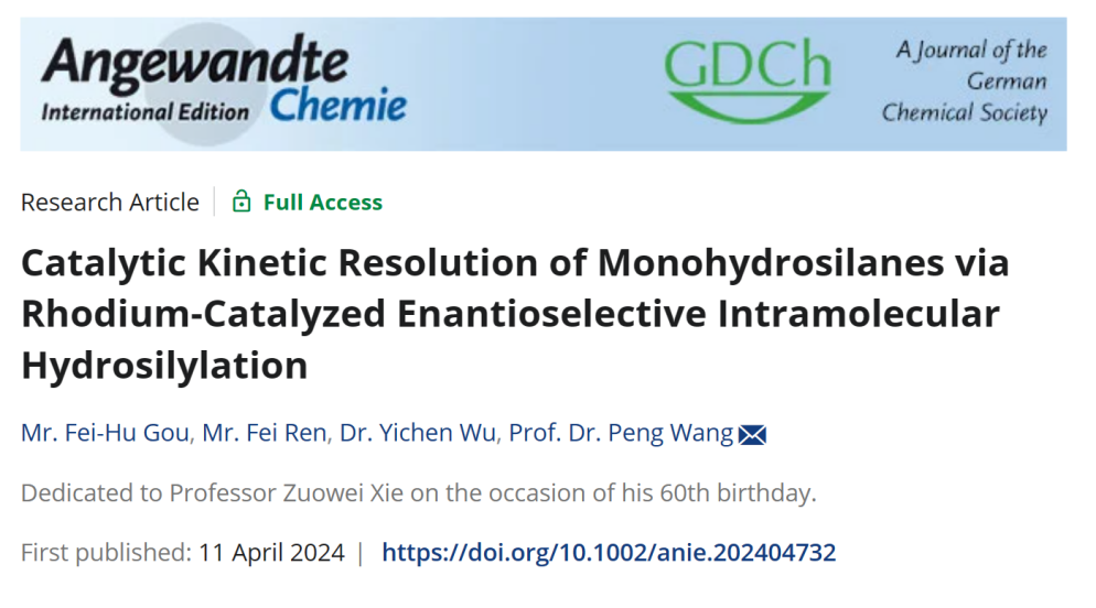 近日,化材學院與中國科學院上海有機化學研究所聯培碩士研究生茍飛虎在Angewandte Chemie International Edition (IF = 16.6)上發表論文“Catalytic Kinetic Resolution of Monohydrosilanes via Rhodium-Catalyzed Enantioselective Intramolecular Hydrosilylation”,通過銠催化分子內不對稱氫硅化反應首次實現了消旋硅烷的催化動力學拆分過程,可同時獲得手性環狀四取代硅烷 (dihydrobenzosilole)和單氫硅烷。上海師范大學為第一通訊單位,化材學院2021級碩士研究生茍飛虎為第一作者,中國科學院上海有機化學研究所王鵬研究員為論文通訊作者。