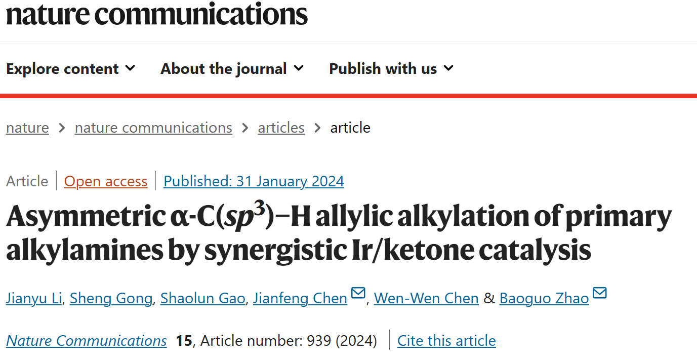 近期,化材學院趙寶國教授、陳劍鋒副研究員團隊在羰基催化伯胺α-C-H不對稱官能化研究中取得重要進展,在《Nature Communications》上發表題為 “Asymmetric α-C(sp3)?H allylic alkylation of primary alkylamines by synergistic Ir/ketone catalysis”的研究論文。該研究運用酮/銥協同催化策略,成功地實現了烷基伯胺α-C-H鍵的不對稱烯丙基烷基化反應,為具有重要生理活性的手性胺類化合物提供了高效便捷的合成新方法。2019級博士研究生李健羽為論文第一作者,趙寶國教授和陳劍鋒副研究員為論文通訊作者。