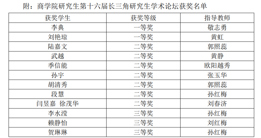 11月24日,由上海市會計學會主辦、上海財經大學會計學院承辦的第十八屆(2023年)長三角研究生學術論壇落下帷幕,論壇共收到來自長三角“三省一市”的上海財經大學、上海海事大學、上海對外經貿大學、上海大學、上海師范大學、復旦大學、同濟大學、華東師范大學、華東政法大學、華東理工大學、上海立信會計金融學院、東華大學、安徽財經大學、安徽工業大學、南京審計大學、南京財經大學、南京師范大學、揚州大學、浙江工商大學、紹興文理學院、寧波大學等 20 余所高校的159篇投稿。在學院的支持下,我校商學院研究生學子積極投稿,共有12篇文章獲得獎項,其中一等獎2篇,二等獎7篇,三等獎3篇,同時學院也第5次獲評優秀組織獎。