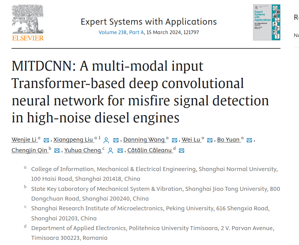 近日,我校信息與機(jī)電工程學(xué)院2020級(jí)電子信息工程創(chuàng)新班本科生李文杰,在SCI中科院一區(qū)期刊《Expert Systems with Applications》上發(fā)表了一篇題為“MITDCNN: A multi-modal input Transformer-based deep convolutional neural network for misfire signal detection in high-noise diesel engines”的高水平論文。《Expert Systems with Applications》是國際計(jì)算機(jī)科學(xué)、人工智能、電子與電氣領(lǐng)域的頂級(jí)學(xué)術(shù)期刊之一,屬于中科院SCI分區(qū)計(jì)算機(jī)科學(xué)大類一區(qū)TOP期刊,同時(shí)也在人工智能小類一區(qū)和電子與電氣小類一區(qū)中名列前茅。該期刊的影響因子為8.665,這一成果將為我校在相關(guān)領(lǐng)域的學(xué)術(shù)聲譽(yù)帶來一定的提升。