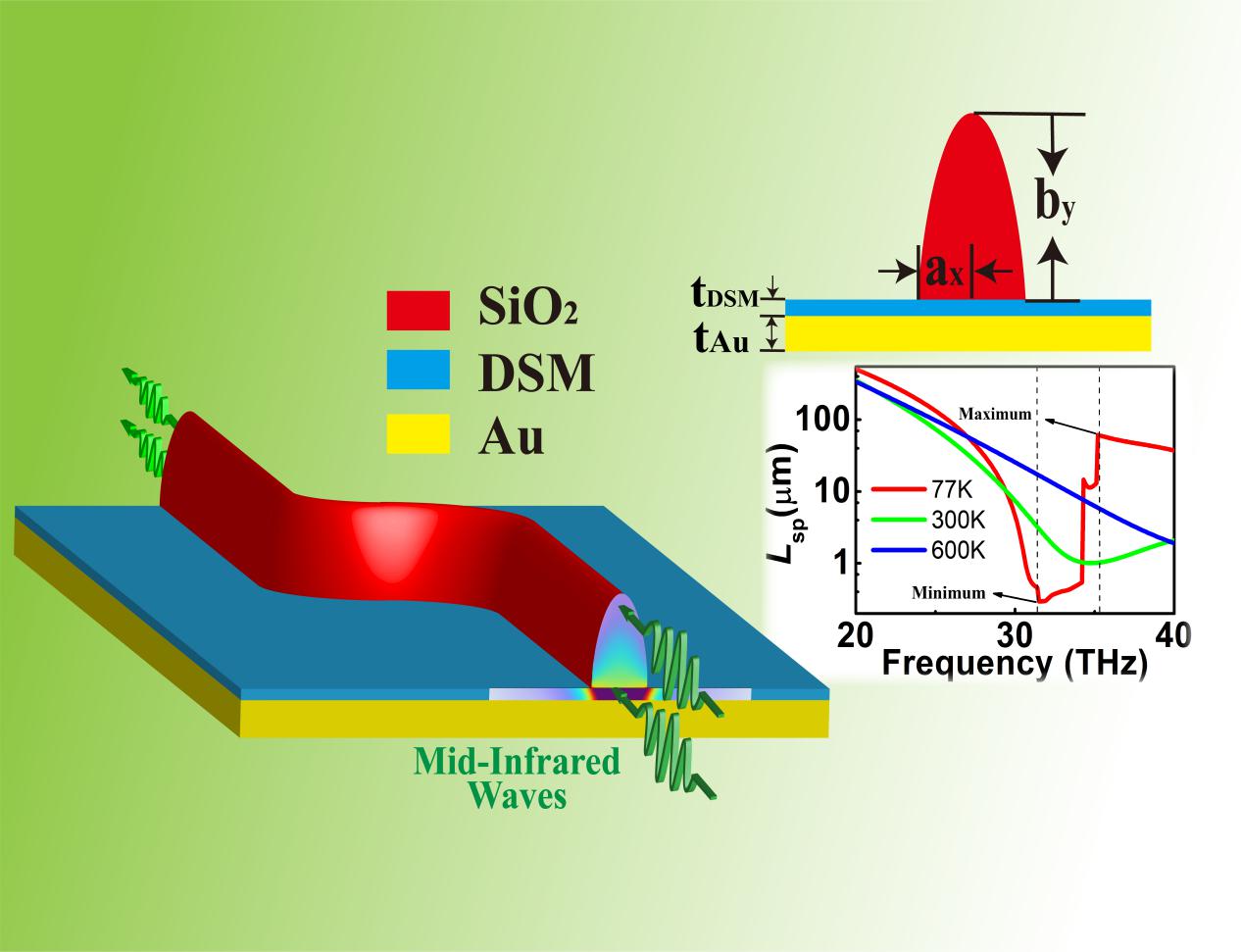 基于3D DSM中的ENZ現象,研究團隊在SiO2-DSM-Au多層混合模式結構基礎上,通過改變溫度、結構參數和費米能級實現了對中紅外波的有效調節。研究表明當溫度小于室溫時,混合模式的傳播長度在ENZ區域出現明顯的突變,如在77 K時的突變比(最大值與最小值的比值)超過200。通過在0.08 ~ 0.15 eV范圍內調節費米能級,傳播長度的突變可以在3.81~45.3范圍內調節,同時ENZ區域最大值的對應頻率從27.9 THz增大到35.5 THz,發生了明顯的藍移現象。上述研究內容對于了解三維狄拉克半金屬調控器件的物理機制、開展新型高性能表面等離子激元功能器件,如低閾值激光器、高品質因子調制器和高品質因子濾波器,提供了新的思路和方法。