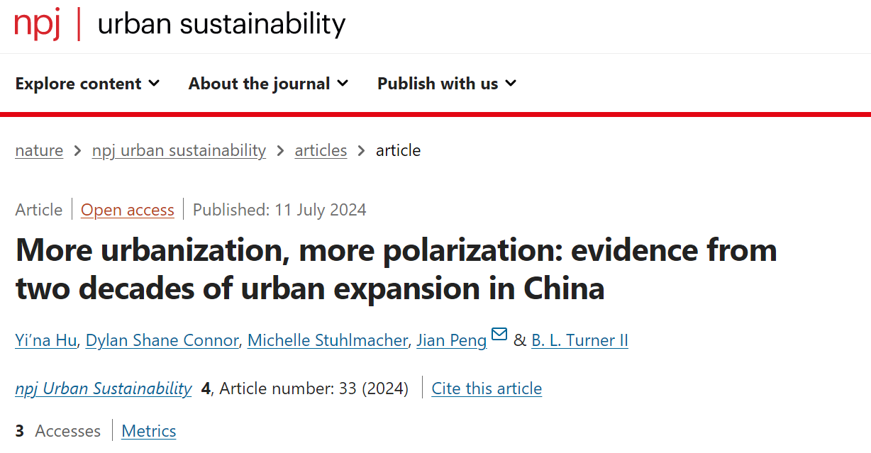 7月11日,環境與地理科學學院講師胡熠娜以第一作者,上海師范大學為第一署名單位,在Nature旗下期刊npj Urban Sustainability上發表題為“More urbanization, more polarization: evidence from two decades of urban expansion in China”的研究論文。npj Urban sustainability是自然出版集團旗下期刊,致力于出版城市可持續性領域高影響力論文。2023年期刊影響因子為9.1,在77本城市研究領域期刊中排名第1。
