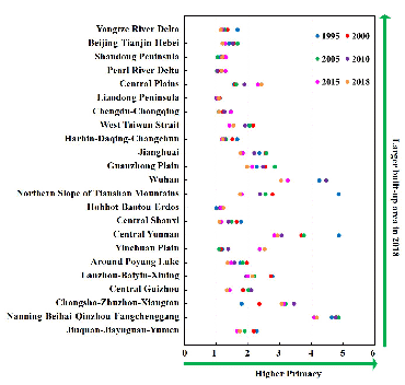 中國作為世界上城市化最快的國家之一,城市數量在1978-2015年從193個增加到650個。然而,大規模城市的發展速度超過小規模城市,引發了人們對區域發展不均衡的擔憂。《國家新型城鎮化規劃(2014-2020年)》提出,構建以城市群和節點城市為依托、其他城鎮化地區為重要組成部分,大中小城市和小城鎮協調發展的“兩橫三縱”城鎮化戰略格局。城市群已成為支撐全國經濟增長、促進區域協調發展的重要平臺。論文以中國23個城市群為研究區,基于Google Earth Engine平臺識別建設用地格局,分析1995-2018年23個城市群的城市規模動態,并基于首位度和帕累托指數檢驗過去二十年中國城市化模式是否導致了城市規模分布日益兩極分化。