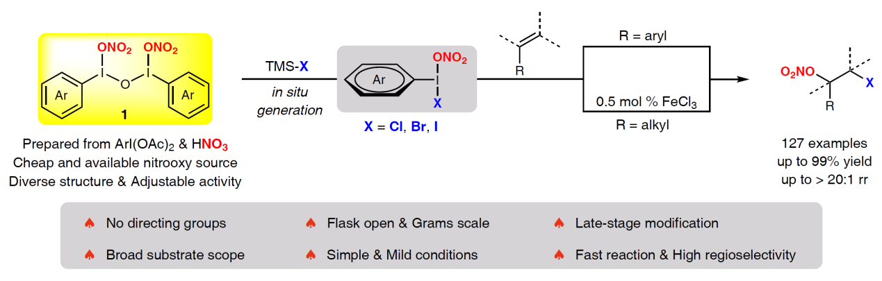 鄧清海教授課題組長期致力于高碘試劑的發展和應用,主要包括高碘疊氮試劑(Nat. Commun., 2024, 15, 4919; Org. Lett., 2023, 25, 2739; Chem. Commun., 2023, 59, 7831; Org. Lett., 2019, 21, 7315)和高碘硝酸酯試劑(Angew. Chem. Int. Ed., 2023, e.202302521; Org. Chem. Front., 2020, 7, 3509)。在此基礎上,發展了一種簡單實用的未活化烯烴高區域選擇性鹵化-硝酸酯化反應新方法。該方法以自主研發的非環高碘硝酸酯試劑和市售的三甲基鹵硅烷(鹵原子可為:氯、溴、碘)為硝酸酯源和鹵源,僅需0.5 mol%的氯化鐵作為催化劑,即可實現烷基烯烴的高區域選擇性鹵化-硝酸酯化反應;芳基烯烴在無催化劑條件下,亦可實現高區域選擇性的鹵化-硝酸酯化反應。該方法實現了127例β-鹵硝酸酯類化合物的合成(收率高達99%,區域選擇性高達>20:1),顯示出廣闊的底物適用范圍和良好的官能團耐受性。值得注意的是,一種衍生自乙烯的合成子2-碘硝酸乙酯能與多種官能團(氧-氫、氮-氫、硫-氫)順利反應。采用本工作策略,可將硝酸酯基團直接或間接引入到阿司匹林、布洛芬、吲哚美辛、吉非羅齊、奧沙普秦、替米沙坦、維生素E、肽等藥物分子或天然產物分子中,預期在有機合成及藥物合成上有著潛在的應用前景。
