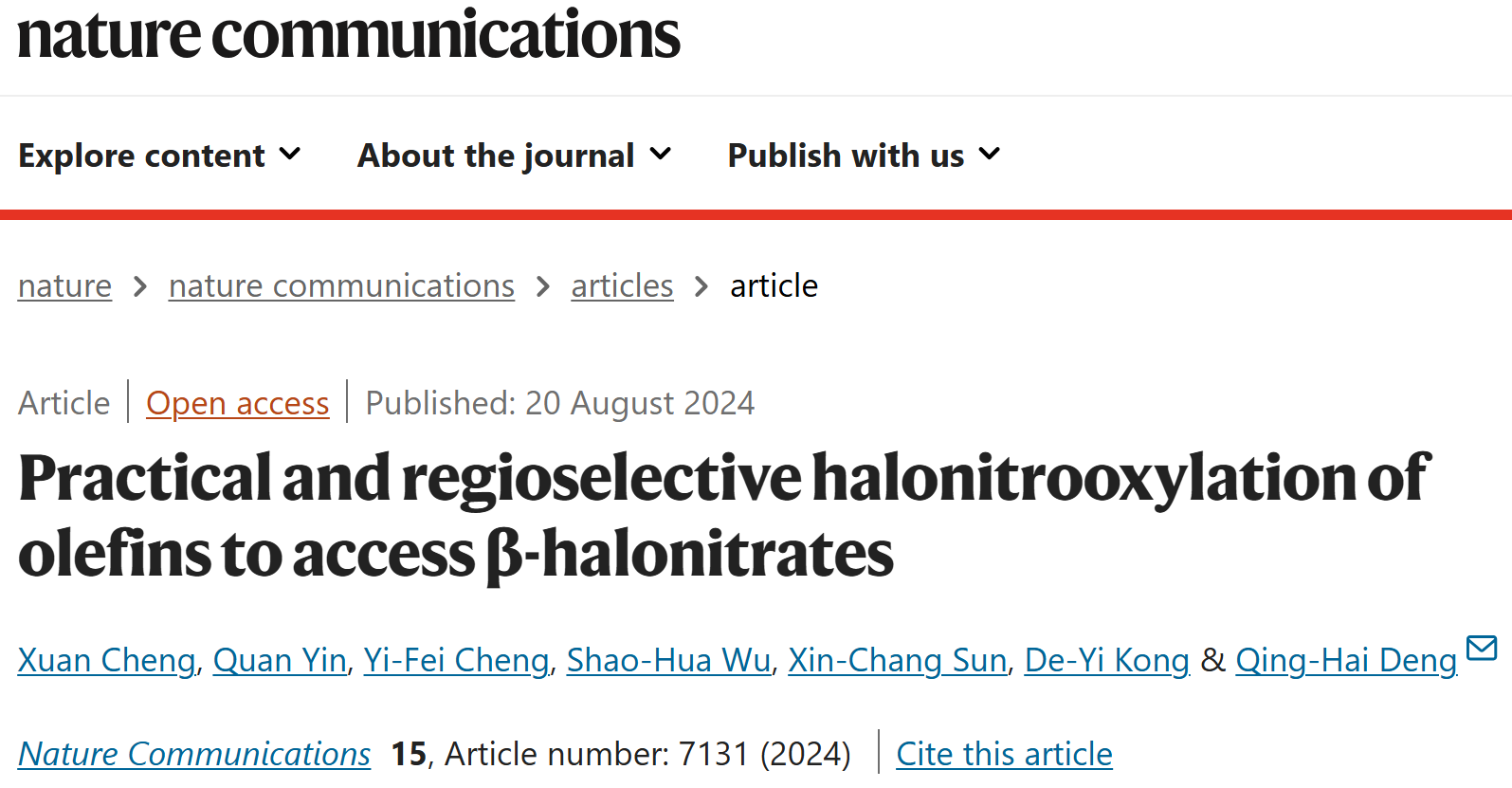 近日,我?;瘜W與材料科學學院鄧清海教授課題組在《Nature Communications》上發表論文“Practical and regioselective halonitrooxylation of olefins to access β-halonitrates”,發展了一種高區域選擇性合成β-鹵代硝酸酯的新方法。上海師范大學為唯一通訊單位,2021級博士生成軒為論文第一作者,鄧清海教授為論文通訊作者。