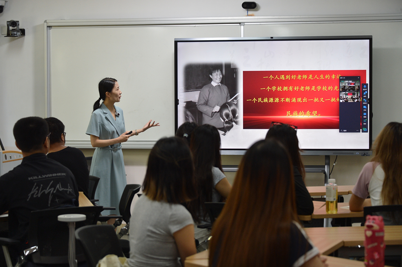 楊伊副教授以“如何做一個好老師”為主線,向學生展示了如何在三尺講臺上踐行“教育家精神”。她生動呈現了于漪老師求學的故事,在教師生涯中潛心教學、愛生如子的故事,以真實的案例為載體,抽絲剝繭地引導學生歸納出一個好的老師既要研究教學內容,做到“博學多能,專而精一”,又要研究教學對象,做到“心中有生,因材施教”,更重要的是在教學實踐中不斷反思,做到“千錘百煉,精進至臻”。最后,楊伊向學生展示了自己在第七屆全國高校青年教師教學競賽備賽期間的反思記錄表和每一天的講課錄像,表示自己正是在于漪老師教育人生的影響下不斷追求卓越,并以自身經歷鼓勵每一個未來教師以實際行動踐行教育家精神。