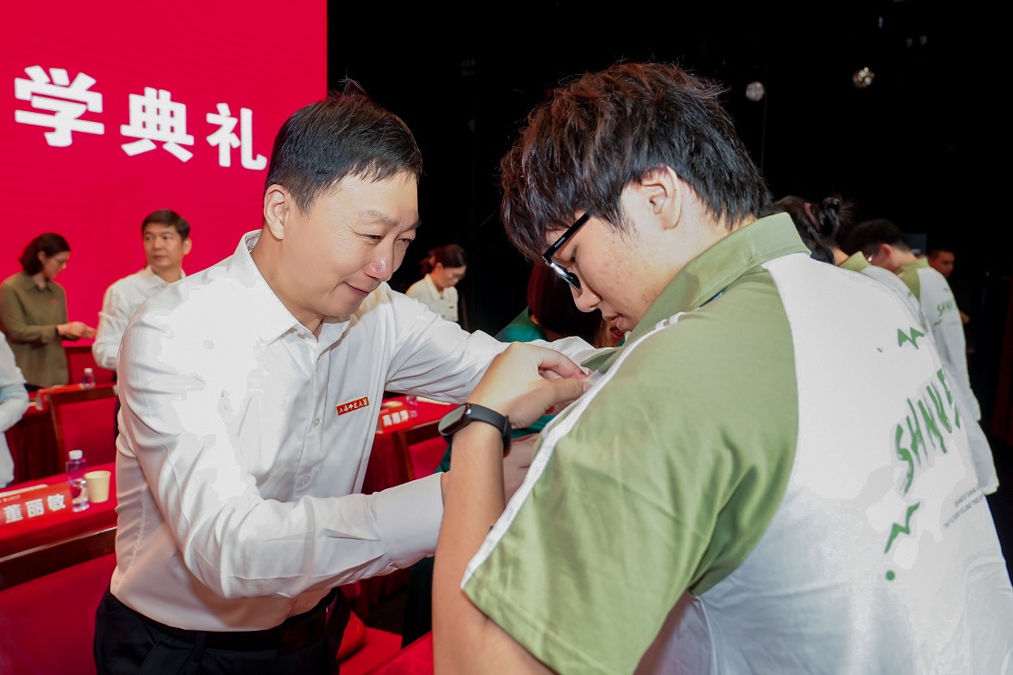 開學典禮在雄壯的國歌聲中拉開序幕。恰同學少年,風華正茂,新生畫像視頻妙趣橫生地勾勒出2024級新生多姿多彩的群像畫卷。典禮上,校院領導為新生代表佩戴校徽。一枚枚校徽蘊藏著師大70年的厚重歷史,凝聚著70年師道永恒的精神文脈,代表著“厚德、博學、求是、篤行”的師大校訓和建設教育強國的責任擔當將由他們薪火有續、代代相傳。