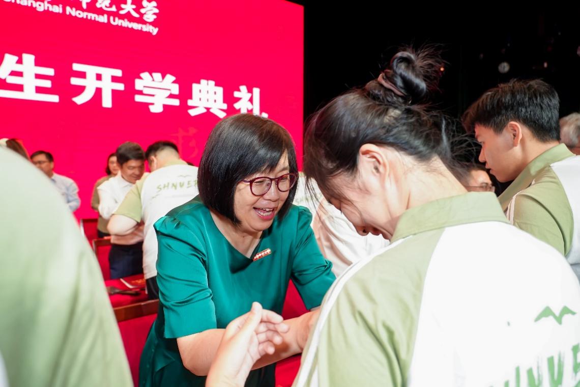 上海市特級教師、正高級教師、全國“最美教師”、全國勞模、全國模范教師,華東師范大學第一附屬中學副校長、1994級政法系校友陳明青老師作為校友代表為新生送上寄語。陳明青老師深情回憶了在師大求知問學的寶貴時光,她勉勵學弟學妹們,領悟無用之用的真諦,探索為人之師的初心,磨煉躬耕講臺的誠意。她講道,在師大的學習時光雖然短暫,但同學們的教育探索之路卻深遠,希望大家傳承弘揚教育家精神,勤學篤行、求是創新。