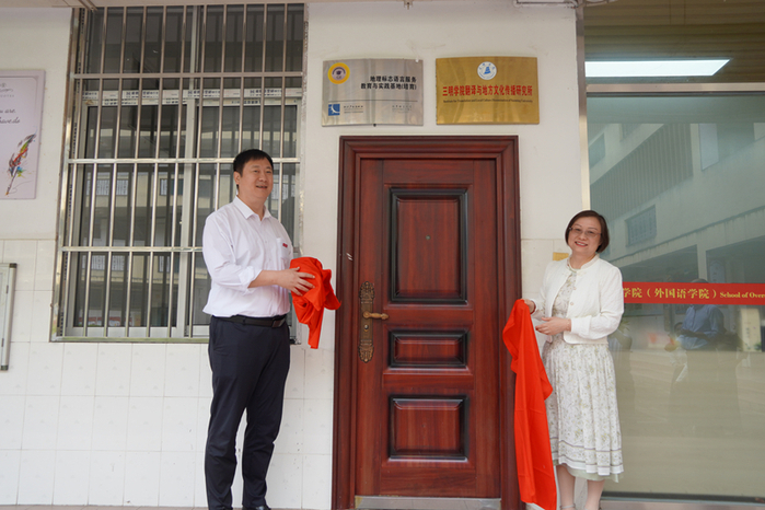 三明學院海外學院(外國語學院)劉景苗書記向與會專家學者介紹了學院發展歷程和滬明合作所取得的成績,并邀請吳龍副校長和盧敏院長為“三明學院翻譯與地方文化傳播研究所”和“地理標志語言服務與實踐基地(培育)”揭牌。
