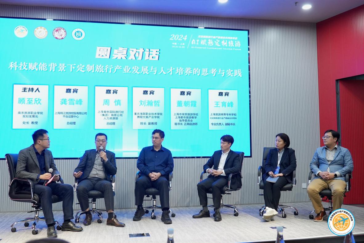 在圓桌討論環節,與會嘉賓就“科技賦能背景下定制旅行產業發展與人才培養的思考與實踐”這一議題展開了深入討論。南京旅游職業學院規劃發展處處長顧至欣教授主持。參與對話的嘉賓是上海錦江旅游控股有限公司平臺運營中心總經理龔雪峰、上海春秋國際旅行社(集團)有限公司人力資源部總經理周慎、重慶海聯職業技術學院攜程文旅產業學院院長劉瀚哲副教授、上海都市旅游教學指導委員會秘書長董朝霞以及泛定制旅游行業產教融合共同體副秘書長兼專業負責人王育峰。