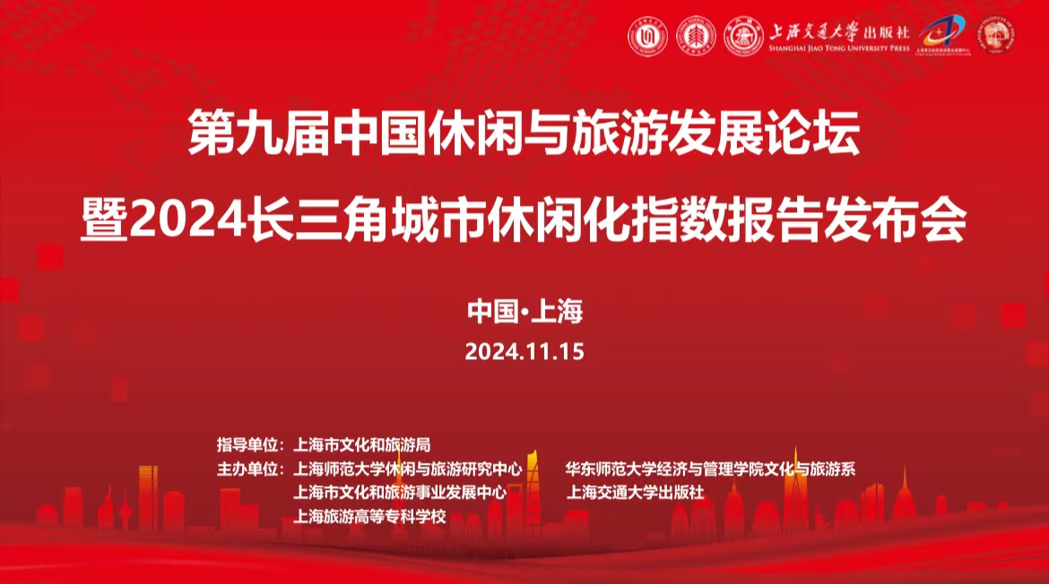 11月15日,“第九屆中國(guó)休閑與旅游發(fā)展論壇暨2024長(zhǎng)三角城市休閑化指數(shù)報(bào)告”發(fā)布會(huì)在上海市文化和旅游事業(yè)發(fā)展中心舉辦。本次會(huì)議由上海市文化和旅游局指導(dǎo),我校休閑與旅游研究中心、華東師范大學(xué)經(jīng)濟(jì)與管理學(xué)院文化與旅游系、上海市文化和旅游事業(yè)發(fā)展中心、上海交通大學(xué)出版社、上海旅游高等專科學(xué)校聯(lián)合主辦。上海多家文旅行政部門、企事業(yè)單位、高校及媒體的嘉賓參加了發(fā)布與研討,為中國(guó)城市休閑和旅游的高質(zhì)量發(fā)展獻(xiàn)計(jì)獻(xiàn)策。