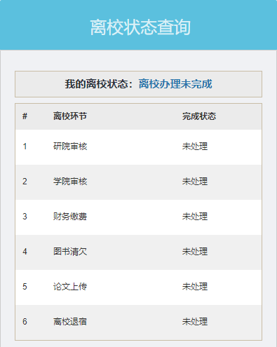 待所有環(huán)節(jié)都通過(guò)后,該學(xué)生的離校狀態(tài)會(huì)顯示“離校辦理完成”;