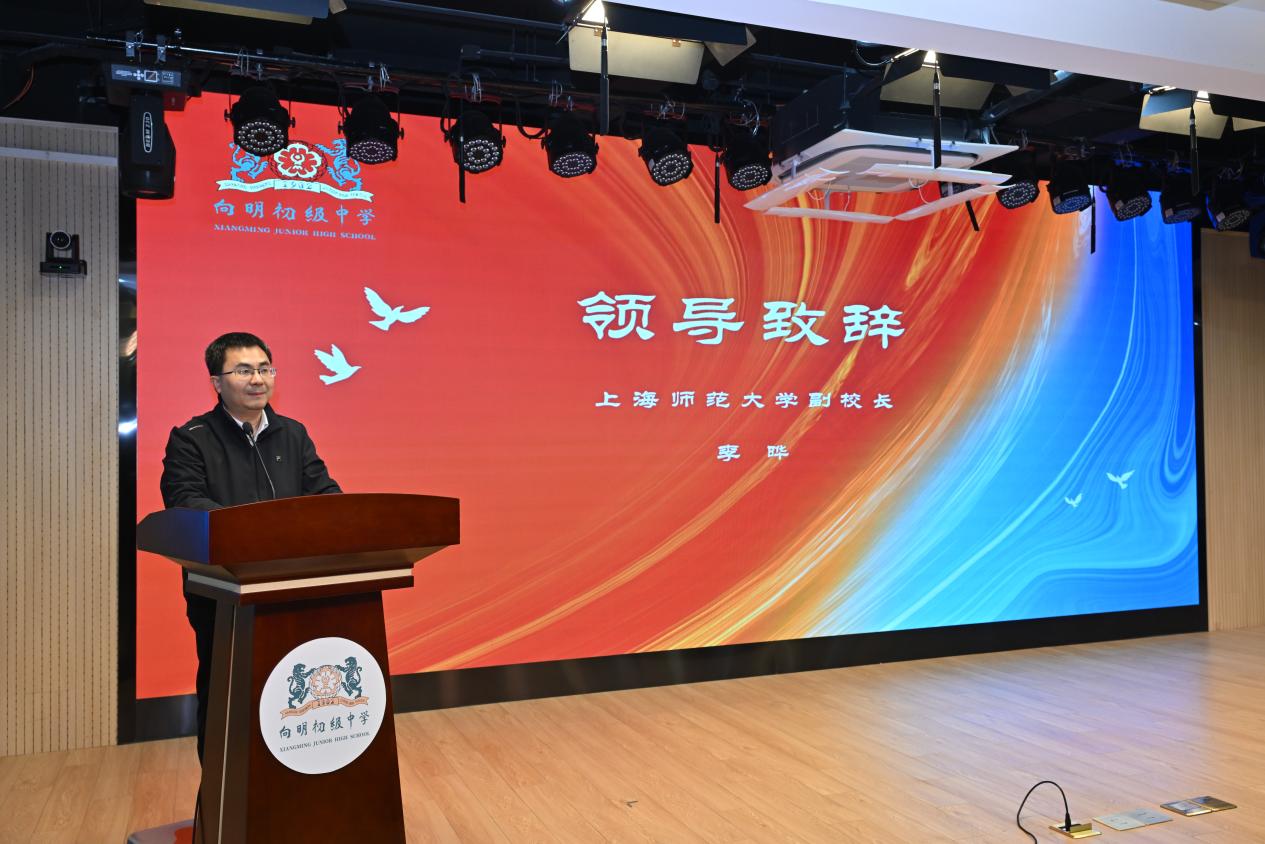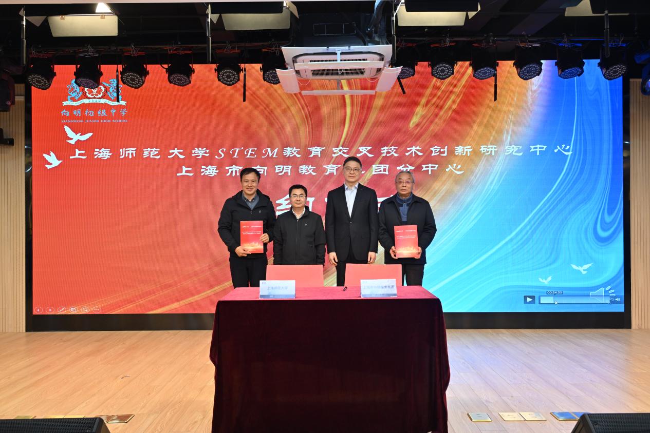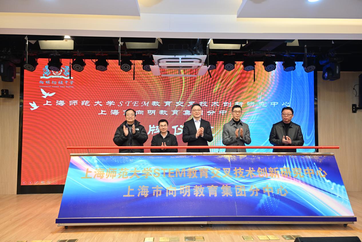 2月21日下午,“二十年,創(chuàng)造教育再出發(fā)”——上海市向明初級中學(xué)更名二十周年主題活動舉行,“上海師范大學(xué)STEM教育交叉技術(shù)創(chuàng)新研究中心(向明教育集團(tuán)分中心)” 在向明初級中學(xué)正式揭牌成立。黃浦區(qū)委常委、區(qū)委宣傳部部長王玉峰,我校副校長李曄,黃浦區(qū)教育黨工委書記陳亮,黃浦區(qū)教育局副局長余維永,黃浦區(qū)教育基金會理事長曹跟林,向明教育集團(tuán)理事長芮仁杰,我校信息與機(jī)電工程學(xué)院主持工作副院長潘建國,上海市教委教研室原副主任、上海市教委教學(xué)研究室顧問趙才欣,向明教育集團(tuán)各成員校校長,我校信息與機(jī)電工程學(xué)院相關(guān)負(fù)責(zé)人以及部分學(xué)生代表出席。