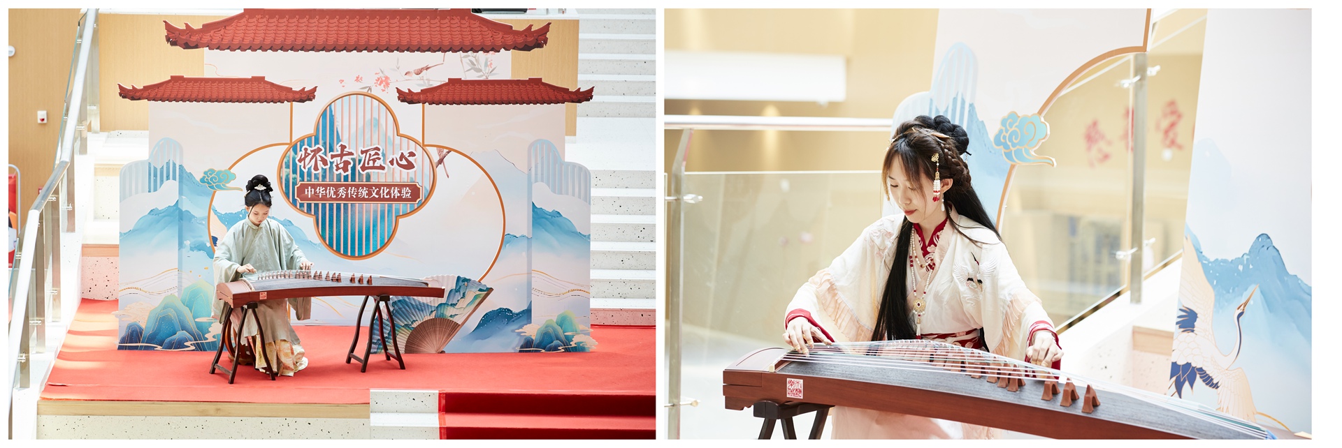 活動現場伴隨著古箏的琴聲,在《高山流水》《漁舟唱晚》的音樂中,同學們沉浸式地感受中國傳統文化之美。