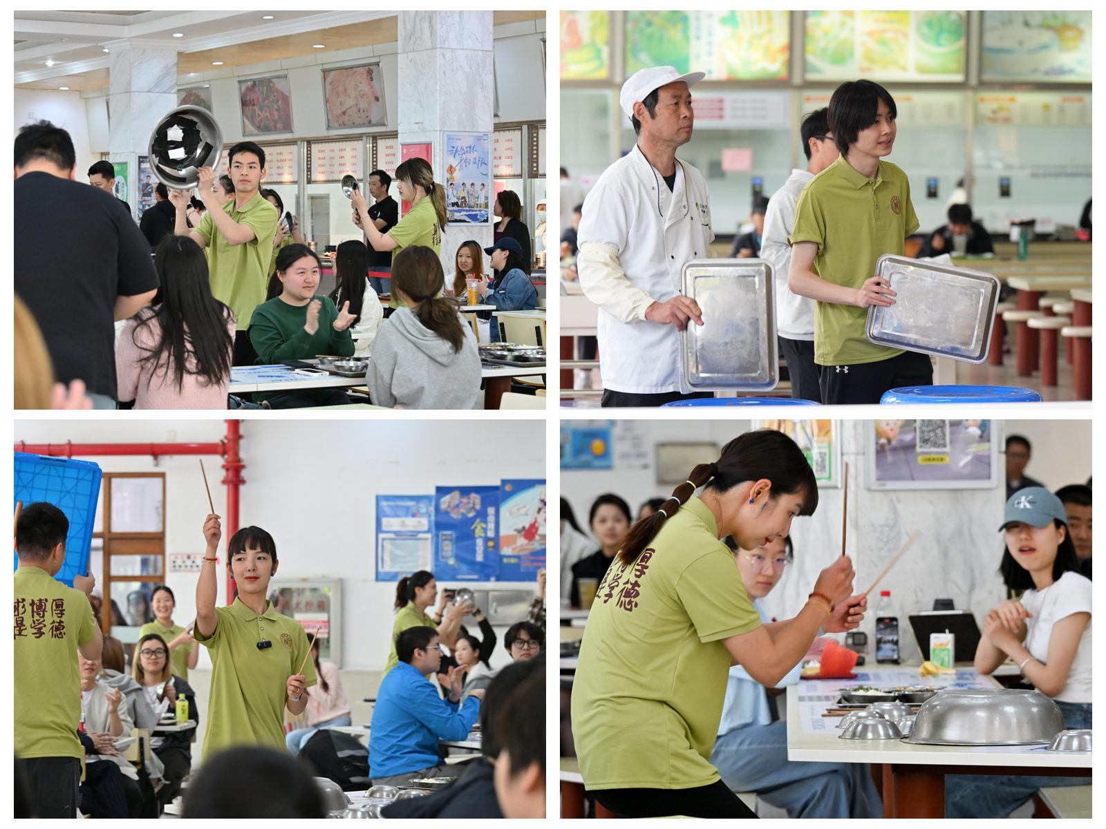 不銹鋼盆化身定音鼓,餐盤堆疊成架子鼓,筷子敲擊調味罐演繹打擊樂聲部。八分鐘的快閃表演中,鍋碗瓢盆的金屬碰撞與餐盤筷子的清脆敲擊完美融合,配合食堂特有的蒸汽聲、翻炒聲,構建出充滿煙火氣的勞動韻律。這場打破藝術與生活界限的演出,讓原本隱匿于幕后的炊事聲響升華為震撼人心的藝術表達。