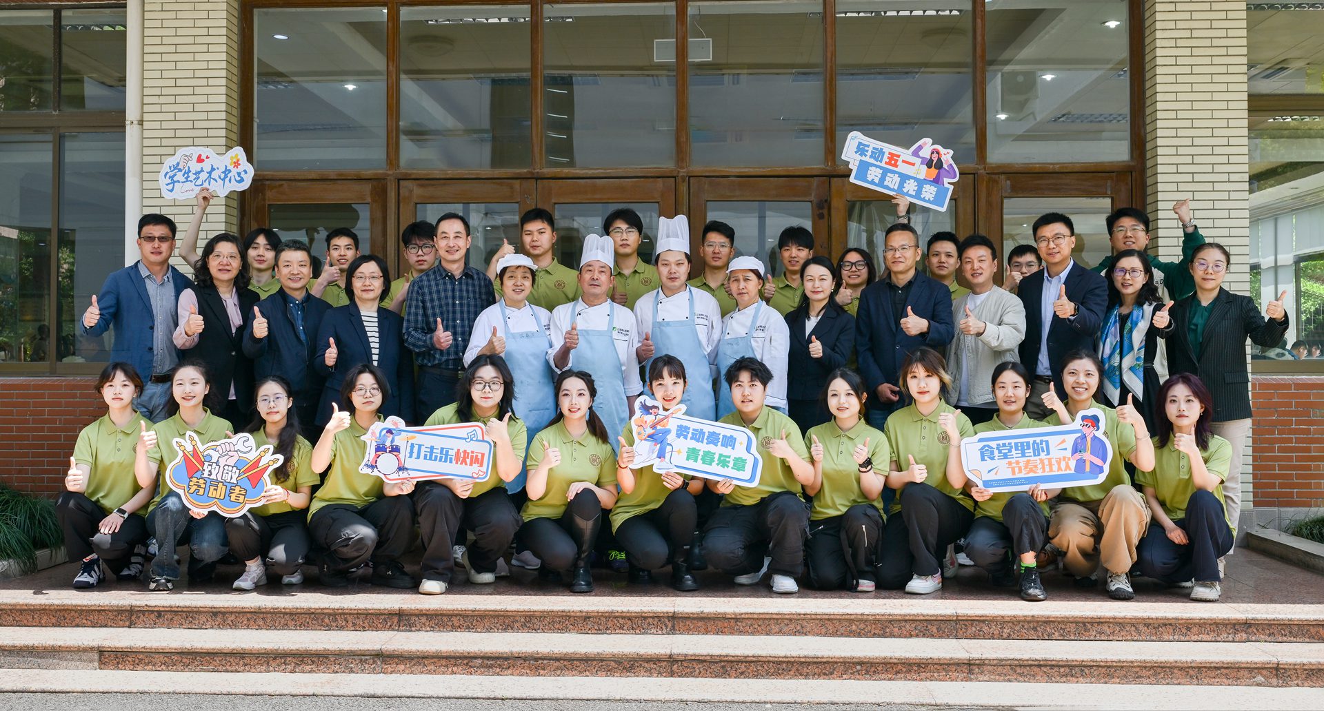 在“五一”國際勞動節來臨之際,徐匯校區紫薇苑南一樓與奉賢校區新玉蘭食堂內,由校學生藝術中心主辦,音樂學院、后勤服務中心、退役軍人學院協辦的食堂美育快閃驚艷上演。校黨委副書記楊海燕、學校相關職能部處和學院的負責人出席本次活動。師生攜手食堂工作者,將勞動工具化作藝術載體,用鍋鏟敲擊、餐盤擊打、菜刀切奏等創意形式,共同演繹原創《勞動狂想曲》,以美育實踐致敬校園里的平凡英雄。