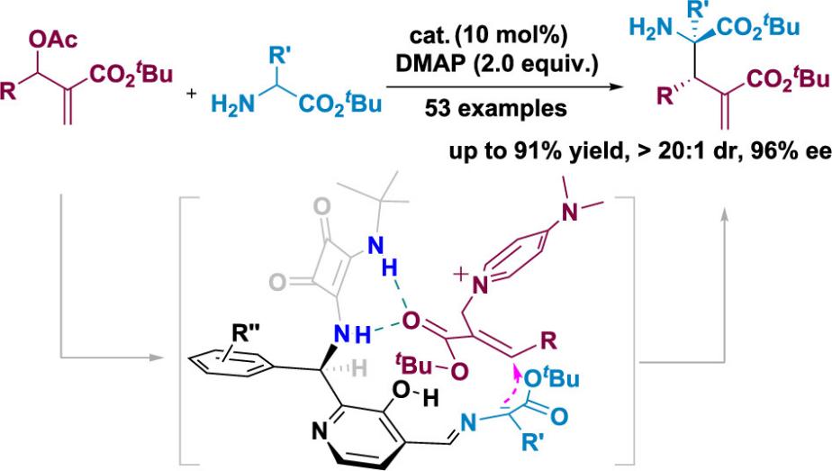 趙寶國教授和肖曉教授團隊基于仿生羰基催化策略,設計并開發了一類全新的中心手性吡哆醛催化劑,該催化劑具有擴大的手性空腔和調控性強的立體結構,在溫和條件下成功實現了未保護α-取代甘氨酸酯與MBH醋酸酯的直接不對稱α-C烷基化反應,以良好的收率和優秀的立體選擇性構建了一系列含有α-季碳手性谷氨酸衍生物。該研究展示了吡哆醛催化劑在不對稱催化領域的強大作用,進一步豐富了吡哆醛催化劑的種類,拓展了基于維生素B6的仿生催化化學。