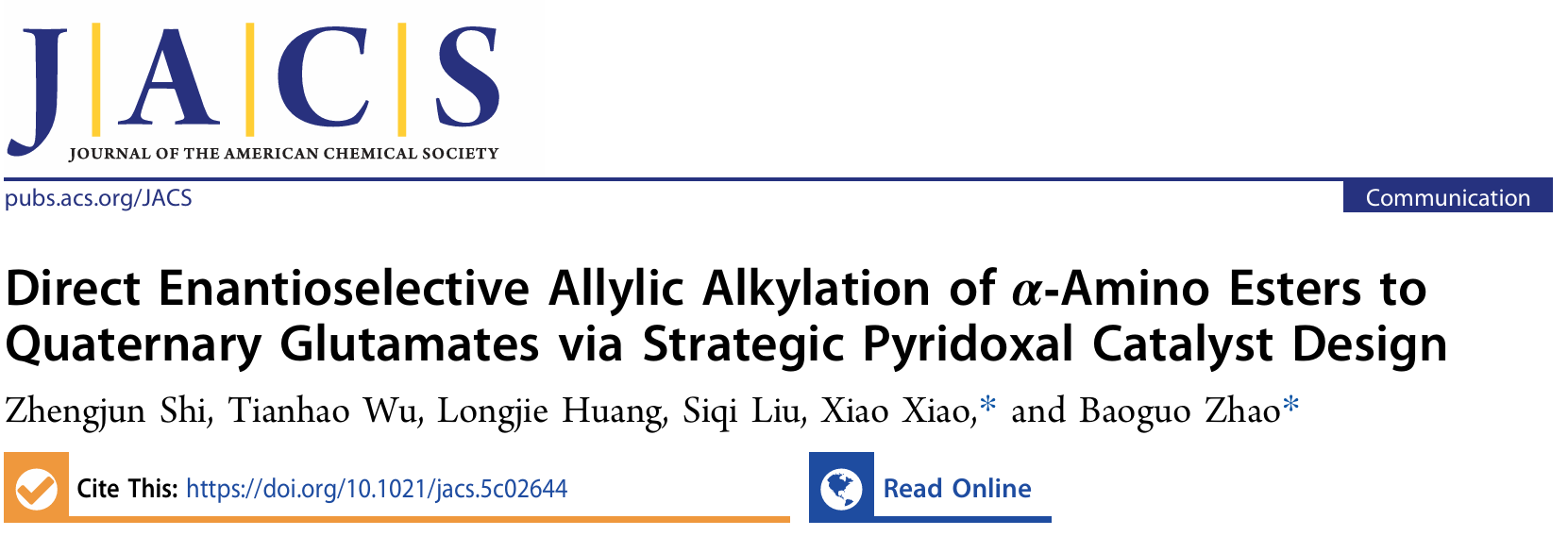 近日,化材學院趙寶國教授和肖曉教授團隊在維生素B6仿生催化領域取得新的進展。他們通過戰略性設計新型中心手性吡哆醛催化劑,實現了非保護的α取代氨基酸酯的直接不對稱烯丙基烷基化反應,生成一系列藥物和合成上十分重要的α季碳谷氨酸衍生物。相關成果以“Direct Enantioselective Allylic Alkylation of α-Amino Esters to Quaternary Glutamates via Strategic Pyridoxal Catalyst Design '為題發表在《Journal of American Chemical Society》上。上海師范大學為唯一署名單位,21級碩士生施政軍為論文第一作者,21級應用化學拔尖班本科生巫天浩為論文第二作者,趙寶國教授和肖曉教授為論文共同通訊作者。