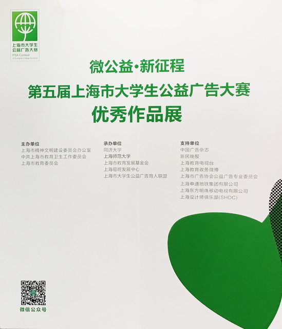 上海市大學(xué)生公益廣告大賽由上海市精神文明建設(shè)委員會(huì)辦公室、中共上海市教育衛(wèi)生工作委員會(huì)、上海市教育委員會(huì)主辦。第五屆大賽活動(dòng)先后收到滬上30所高校2400多件作品,其中平面類1686件、視頻類269件、廣播類144件、文案類176件、新媒體(H5)類154件,2000多名學(xué)生參賽,我校學(xué)生獲得平面類、文案類等競(jìng)賽單元多項(xiàng)銀獎(jiǎng)、銅獎(jiǎng)。這些作品充分展示了上海大學(xué)生創(chuàng)新創(chuàng)造的設(shè)計(jì)能力和崇德向善的公益情懷,部分優(yōu)秀作品先后地鐵九、十號(hào)線列車及上海市各高校進(jìn)行展出。