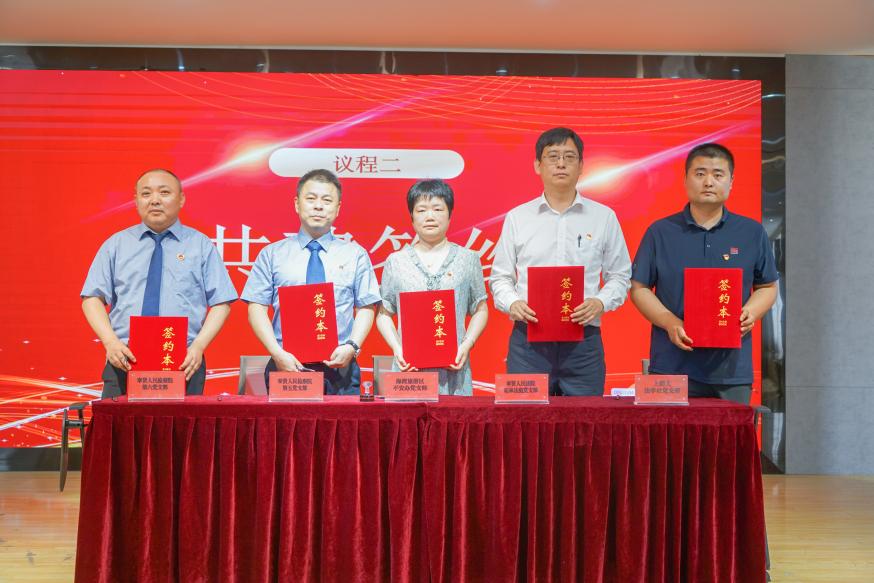 活動現場,海灣旅游區平安建設辦公室黨支部與奉賢區人民法院柘林法庭黨支部、奉賢區人民檢察院第五黨支部及第六黨支部、我校哲學與法政學院法學社黨支部簽署結對共建協議。此次共建是貫徹落實習近平法治思想、推動高校資源與基層治理需求深度融合的重要實踐,更是提升青年學生法治實踐能力的關鍵平臺。