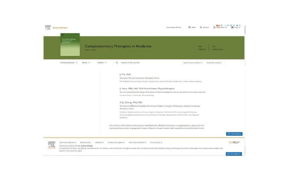 近日,我校體育學院尹劍春教授應邀擔任國際學術期刊《Complementary Therapies in Medicine》(Elsevier 出版)編委(Editorial Board Member)。 該期刊被Web of Sciences核心合集SCI數據庫收錄,專注于補充與替代醫學領域的研究,具有較高的學術影響力,其最新影響因子(Impact Factor)為3.3,CiteScore為8.6,在JCR分類中位列“全科與補充醫學”類期刊(共21種)第9名,屬Q2分區。