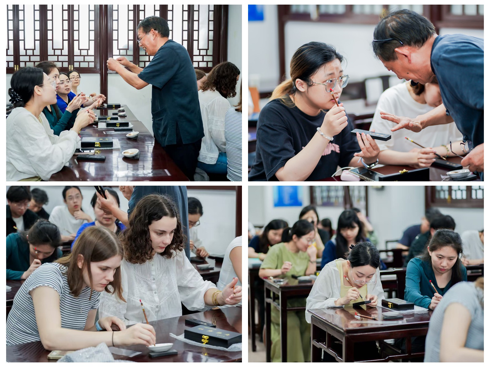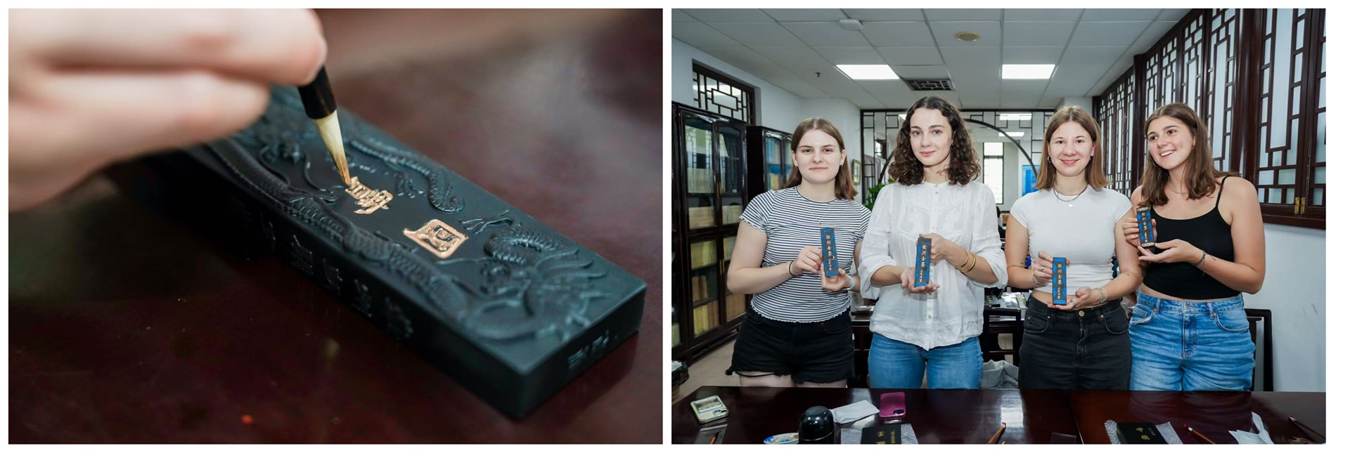 一碟,一筆,一墨,參與者興致勃勃地投入到體驗(yàn)活動(dòng)中。中外師生一道輕輕攪動(dòng)碟中的金粉和描金水,提起毛筆,在雕刻精美的墨錠上輕勾細(xì)描,添色涂彩,頃刻間“國寶”金字絢爛奪目,龍鳳紋樣流光溢彩。中外師生一致發(fā)出強(qiáng)烈的感慨:傳統(tǒng)徽墨不僅凝聚著中華文明的精粹,更是文化自信的活態(tài)載體。