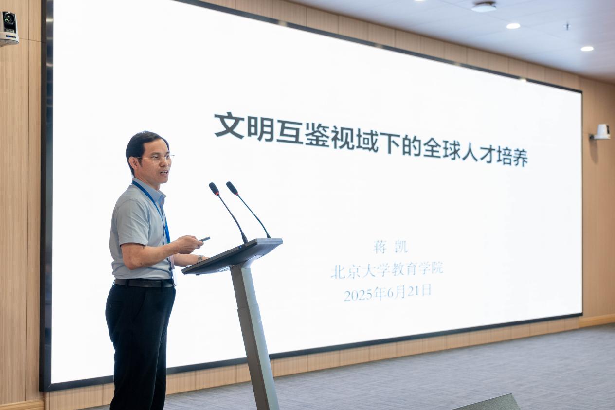 北京大學(xué)教育學(xué)院院長(zhǎng)蔣凱教授從文明互鑒的視域下探討了全球人才培養(yǎng)。他介紹了全球人才培養(yǎng)的三個(gè)維度、歷史發(fā)展情況以及國(guó)際學(xué)生流動(dòng)的全球格局演變,并分別以美國(guó)、英國(guó)、中國(guó)和日本為例具體闡述了國(guó)際學(xué)生流動(dòng)的四種動(dòng)因。同時(shí),他指出,當(dāng)前全球局勢(shì)對(duì)國(guó)際教育帶來(lái)了眾多挑戰(zhàn),包括合作機(jī)制弱化、地緣沖突頻發(fā)、學(xué)術(shù)開(kāi)放性受限以及國(guó)際信任赤字?jǐn)U大。此外,他從交往行為理論出發(fā),講述了交往行為理論在全球人才培養(yǎng)中的解釋力以及對(duì)全球人才培養(yǎng)的指導(dǎo)作用。最后他強(qiáng)調(diào)了面向未來(lái)的全球人才培養(yǎng)的五個(gè)關(guān)鍵詞:責(zé)任、包容、對(duì)話、合作和創(chuàng)新,闡述了未來(lái)全球人才培養(yǎng)的理念和實(shí)踐呼吁。