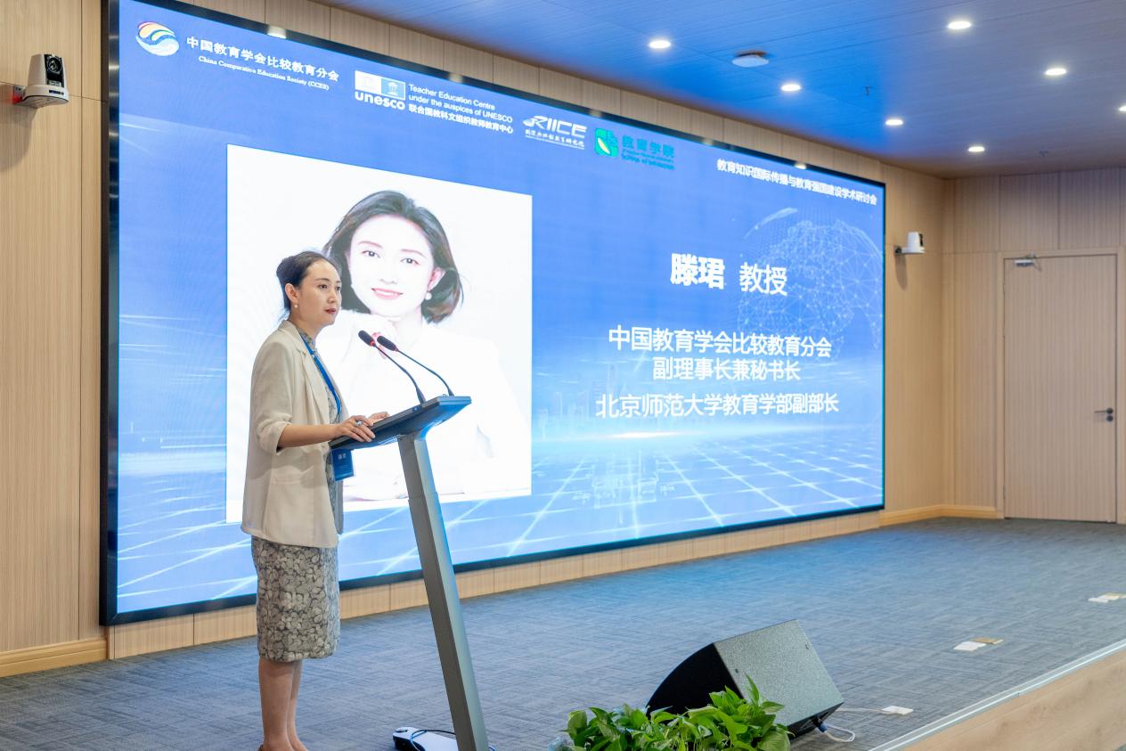 中國(guó)教育學(xué)會(huì)比較教育分會(huì)副理事長(zhǎng)兼秘書(shū)長(zhǎng)、北京師范大學(xué)教育學(xué)部副部長(zhǎng)滕珺教授代表比較教育分會(huì)發(fā)表致辭。滕珺教授感謝上海師范大學(xué)和聯(lián)合國(guó)教科文組織教師教育中心教師團(tuán)隊(duì)為比較教育學(xué)科提供的眾多專(zhuān)業(yè)支持、為此次會(huì)議做出的精心籌備以及在推動(dòng)教育國(guó)際傳播方面所付出的努力和貢獻(xiàn),感謝全國(guó)學(xué)者為此次會(huì)議話題貢獻(xiàn)智慧,祝愿各位學(xué)者能夠收獲知識(shí)生產(chǎn)的成果。
