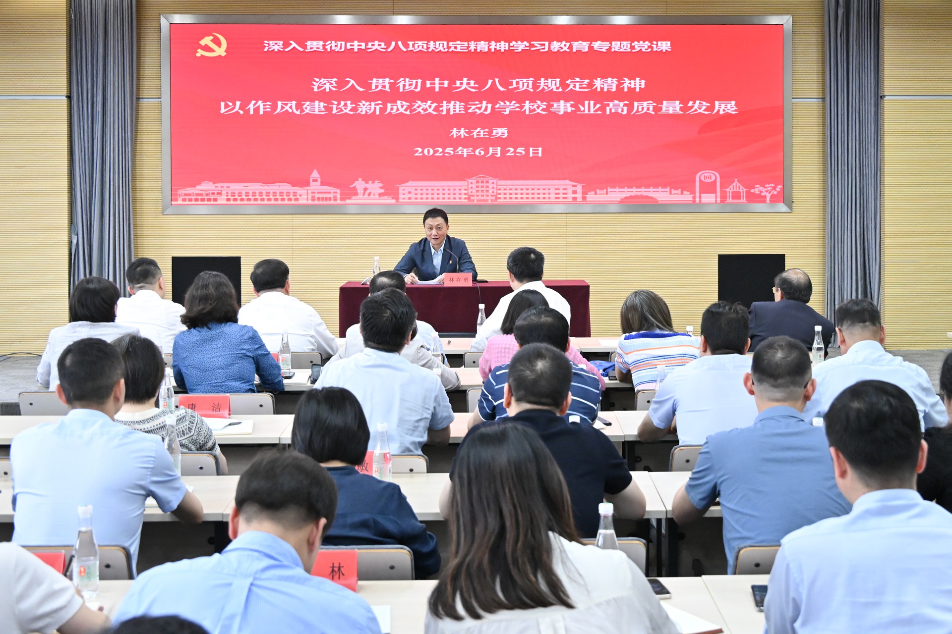 6月25日下午,學校黨委書記林在勇以《深入貫徹中央八項規定精神 以作風建設新成效推動學校事業高質量發展》為題講授深入貫徹中央八項規定精神學習教育專題黨課。校領導班子成員、校紀委委員、二級單位黨政負責人、職能部處負責人及學校辦公室黨支部全體黨員參加黨課學習。
