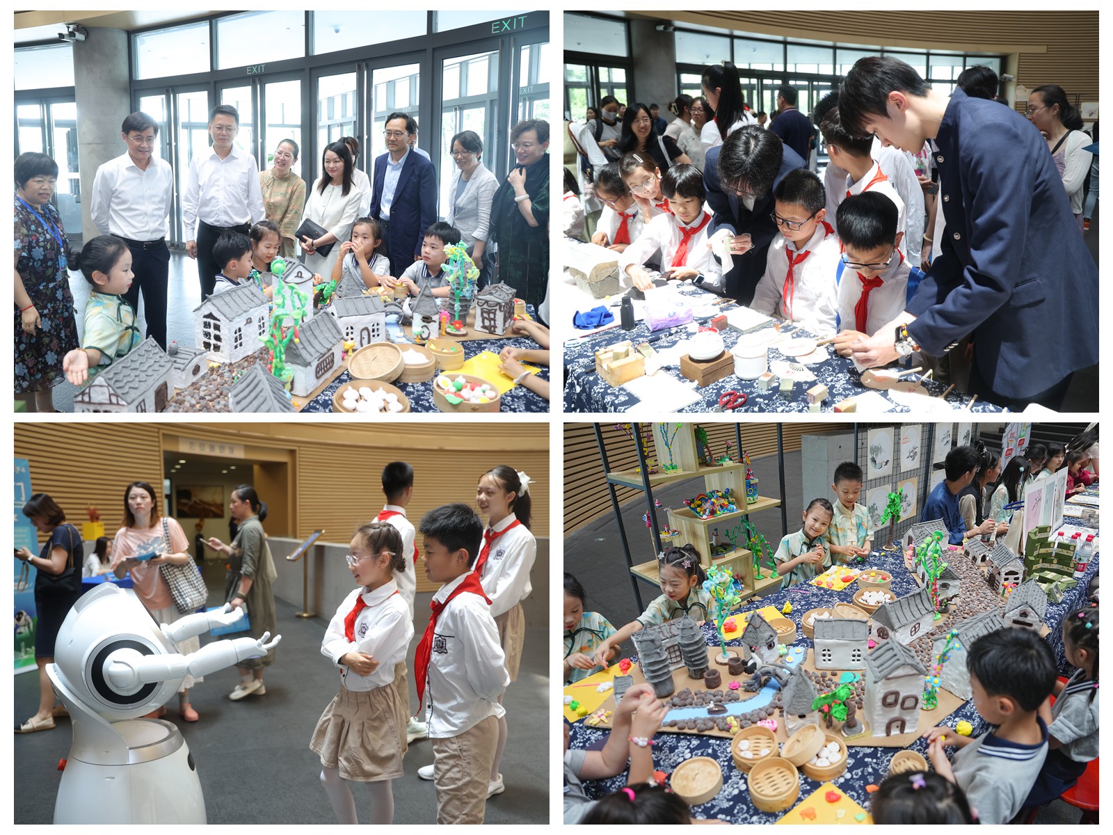 活動伊始,師生們饒有興致地觀摩了多維展廳豐富多彩的實踐活動,沉浸式體驗了美育實踐活動的熱烈氛圍。一樓展廳化身為“鄉村美育特色長廊”,鄉土文化在指尖煥發新生機,大家對上海師大嘉定基礎教育集團校學生創作的黏土、蘇繡、版畫、書畫、剪紙、篆刻作品予以贊賞。二樓“AI藝境探索站”則構建未來美育圖景,學生們穿梭于“智語之門”“樂享音創”“鏡像舞者”等七大互動區域,親身體驗人工智能與傳統藝術碰撞的奇妙火花。生動活潑、寓教于樂的外場實踐,正是美育課堂的寶貴延伸,有效打通了美育融入學生日常的“最后一公里”,有力詮釋了美育浸潤校園的深厚底蘊與勃勃生機。