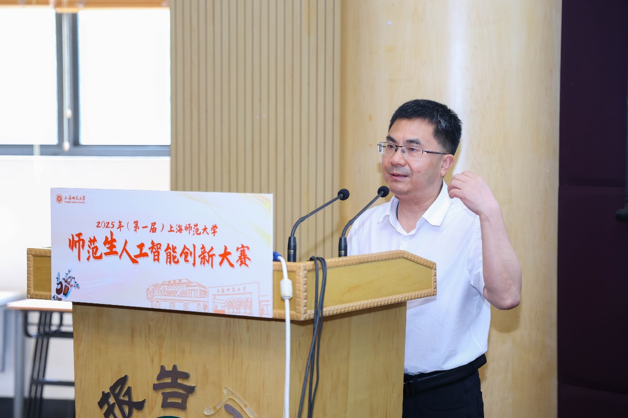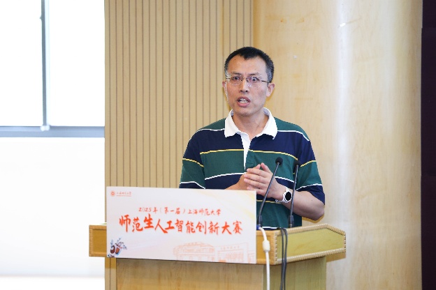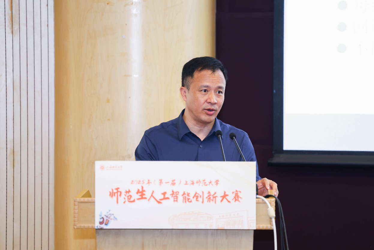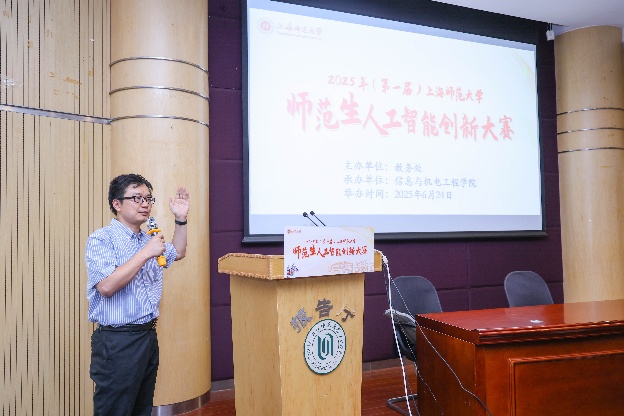在人工智能推動(dòng)教育數(shù)字化轉(zhuǎn)型的背景下,6月24日下午,上海師范大學(xué)(第一屆)師范生人工智能創(chuàng)新大賽在奉賢校區(qū)舉辦。大賽由校教務(wù)處主辦,信息與機(jī)電工程學(xué)院承辦。大賽組委會(huì)顧問、副校長李曄,校教務(wù)處副處長瞿雪萍,大賽組委會(huì)執(zhí)行主任、信機(jī)學(xué)院主持工作副院長潘建國,校內(nèi)外評(píng)委專家,大賽組委會(huì)成員,以及參賽學(xué)生出席大賽開幕式。信機(jī)學(xué)院計(jì)算機(jī)系副主任朱炯主持開幕式。