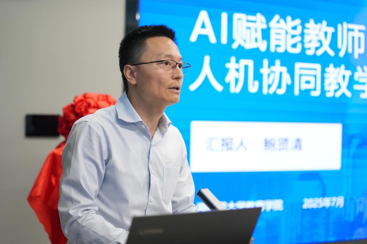 黃海濤在致辭中表示,該項(xiàng)目旨在幫助教育學(xué)院建立完整的人機(jī)協(xié)同教學(xué)能力培養(yǎng)體系,培養(yǎng)能夠充分發(fā)揮AI技術(shù)輔助優(yōu)勢(shì)的新時(shí)代卓越教師。他強(qiáng)調(diào),項(xiàng)目將為學(xué)院教育教學(xué)改革注入強(qiáng)勁新動(dòng)力,努力為學(xué)校的教師教育數(shù)字化轉(zhuǎn)型提供解決方案。
