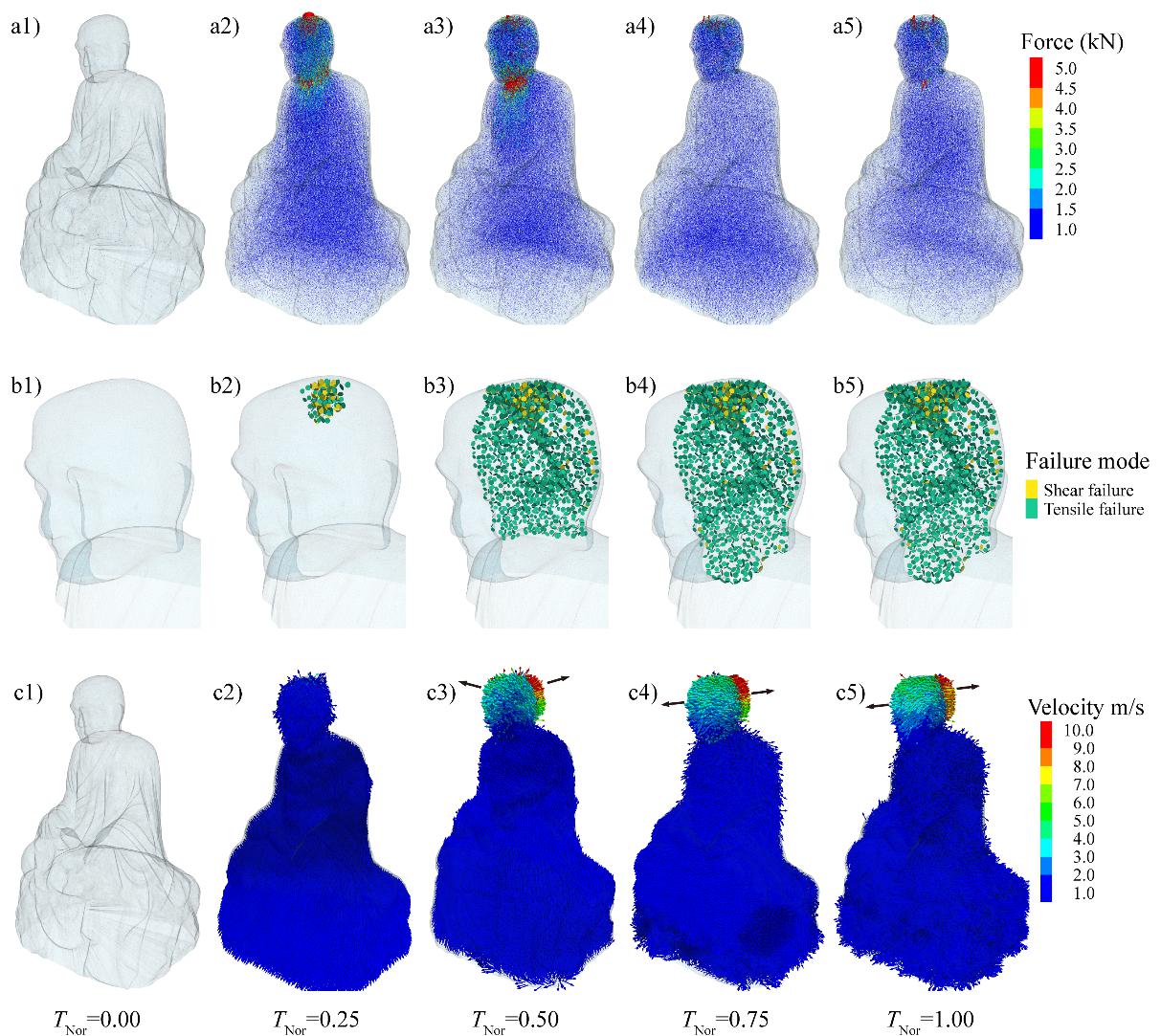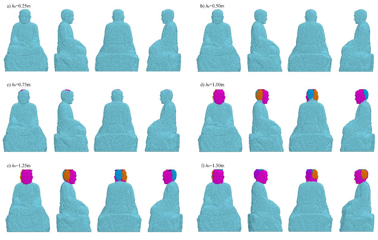 進一步模擬結果表明,在不同沖擊強度下,佛像呈現出顯著分化的破壞模式:低沖擊強度易引發表層顆粒脫落,中等強度易導致局部破壞,而高沖擊強度則會觸發佛像頭部貫穿性斷裂,并伴隨碎片飛散等嚴重失穩現象的發生。