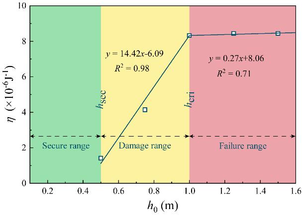 基于上述研究,課題組首次提出“應變能損傷指標”用于刻畫輸入能量向結構損傷的轉化效率,明確了沖擊能量與損傷程度之間的定量關系,并提出兩個具有工程意義的臨界高度,為石質文物抗沖擊性能評估與快速風險分級提供了理論支撐。