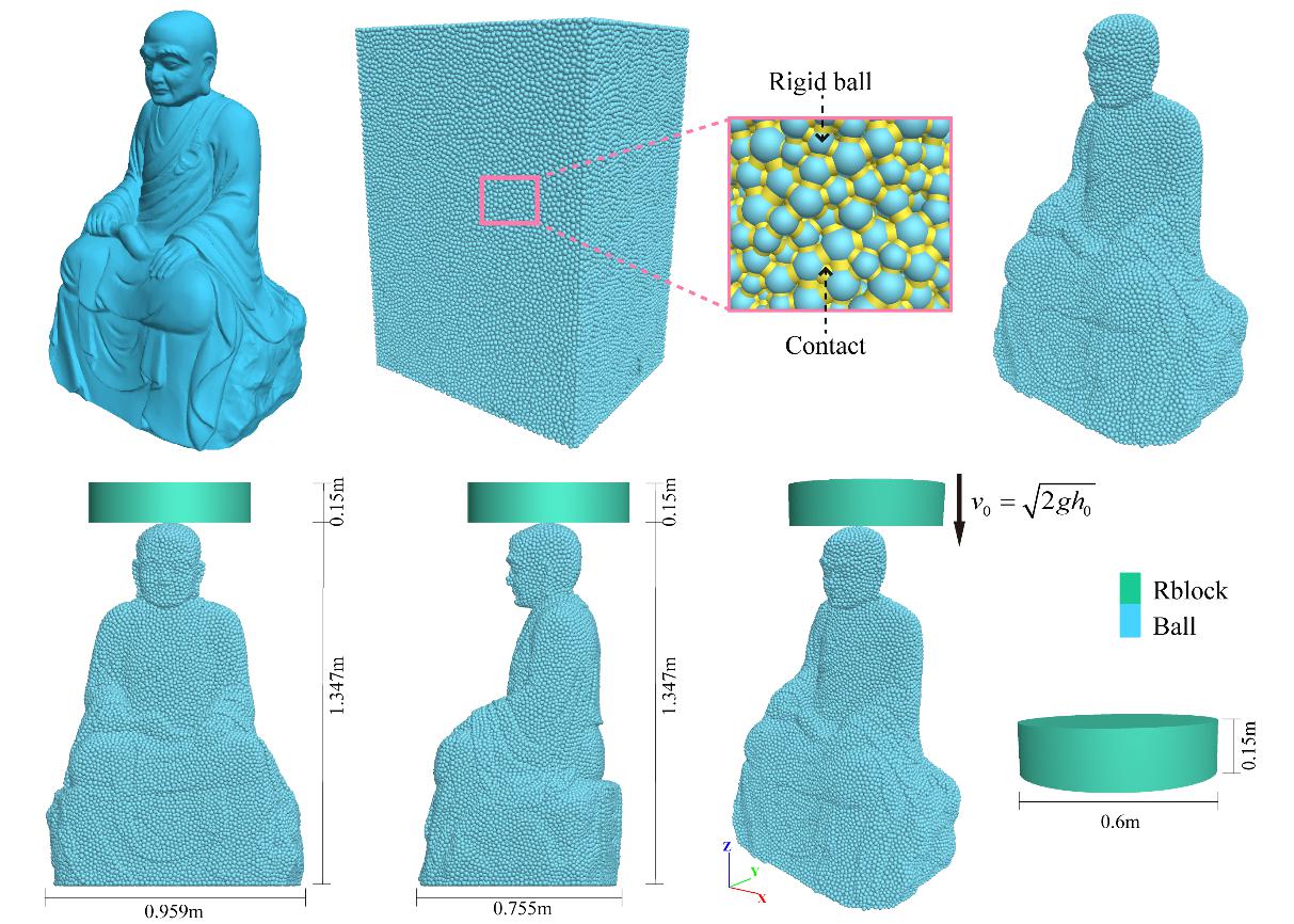 研究首次將離散元方法系統引入文物保護領域,通過融合佛像復雜幾何形貌與巖石材料力學參數,構建高精度DEM模型,模擬六種墜落高度(0.25–1.50?m)下石窟寺頂板剝落的典型沖擊場景,全面解析沖擊載荷作用下佛像的力學響應與損傷演化機制。