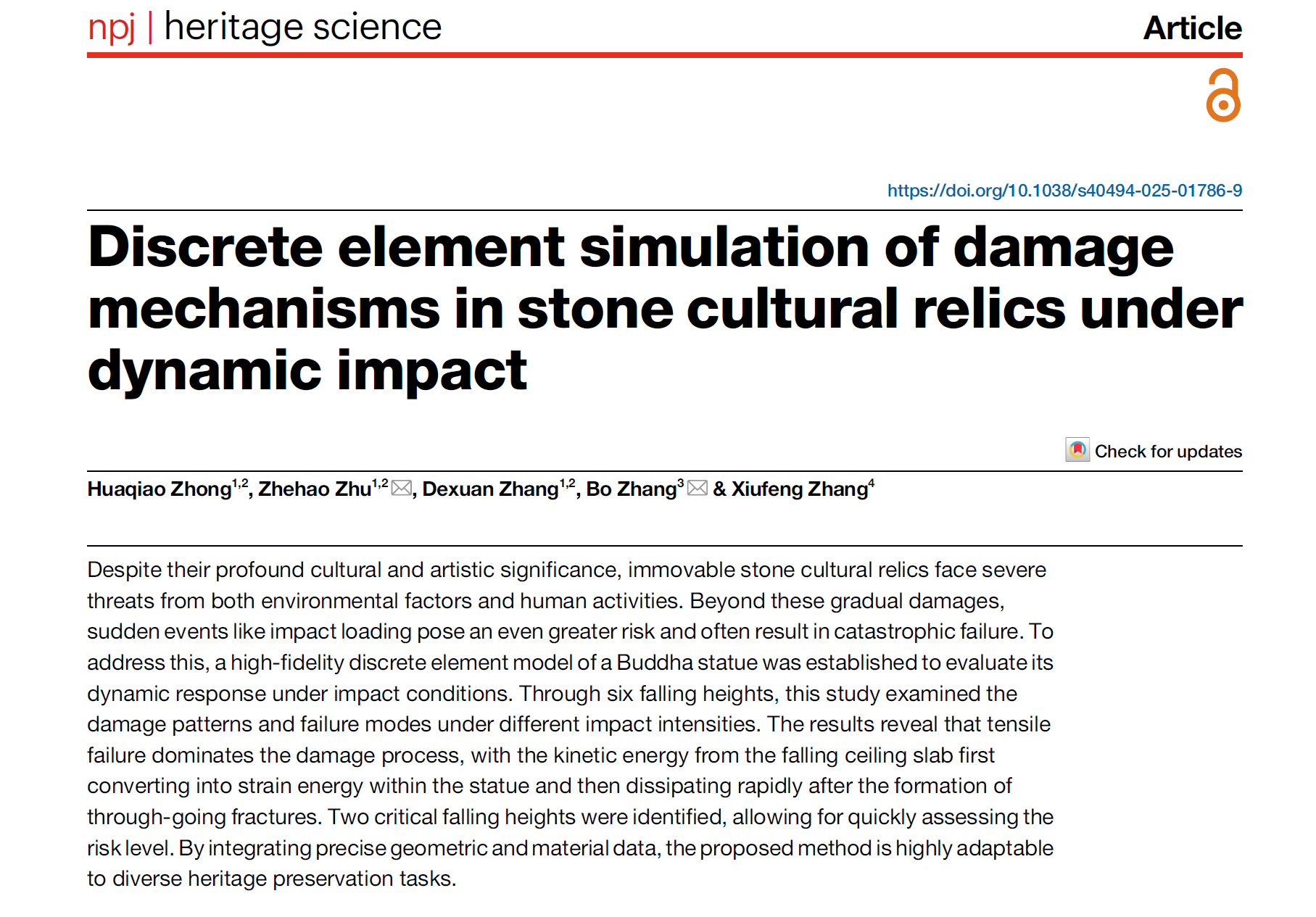 為攻克上述技術瓶頸,上海師范大學建筑工程學院巖土工程創新團隊與敦煌研究院持續深化合作,依托甘肅省科技進步一等獎的研究成果,構建了一套融合離散元法與多尺度響應分析的高精度結構劣化評估體系。該論文《Discrete element simulation of damage mechanisms in stone cultural relics under dynamic impact》近期發表于Nature旗下期刊《npj heritage science》,由我校建筑工程學院土木工程專業碩士研究生鐘華鍬擔任第一作者,上海師范大學為第一完成單位。建筑工程學院朱哲皓與敦煌研究院張博共同擔任論文通訊作者。