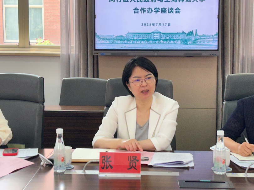 張賢在講話中從區域發展戰略高度擘畫了合作新愿景。她表示,閔行區人民政府與上海師范大學合作淵源深厚,有基礎,有成效,也有新目標。站在“十五五”規劃謀篇布局的重要節點,閔行區將與上海師范大學繼續深化合作,積極引入高校優質資源,推動區域教育優質均衡發展。依托閔行區區位優勢與上海師范大學學科資源優勢,在雙方合作辦學的良好基礎上,希望以課題合作為抓手,在教師專業發展體系構建、特色教育品牌打造、拔尖創新人才早期識別與培養等方面組建聯合攻關團隊,實現突破性進展,全面提升區域教育的核心競爭力與品牌顯示度。