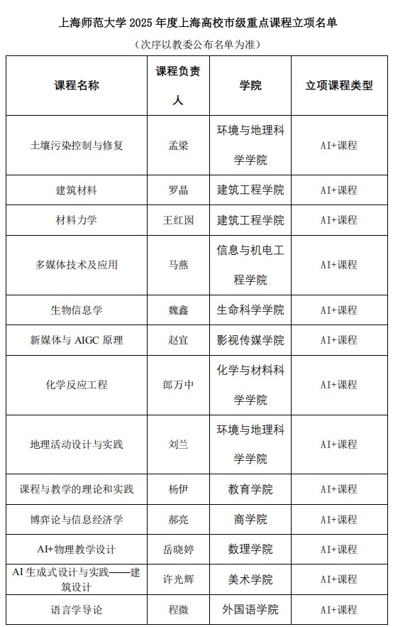 近日,上海市教委發布《上海市教育委員會關于公布2025年度上海高校市級重點課程立項名單的通知》(滬教委高〔2025〕30號)。我校共有35門課程獲得2025年度上海高校市級重點課程立項(AI+課程23門、產教融合課程1門、緊缺急需人才領域課程1門、實驗實訓實踐課程10門),立項數量位居上海高校第三名,其中AI+課程、實驗實訓實踐課程獲得立項數位居上海高校第一名。