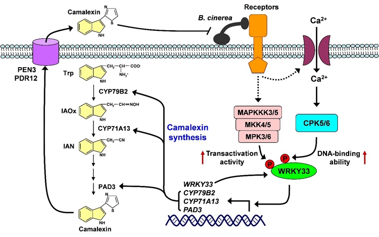 Zhou J., Wang X., He Y., Sang T., Wang P., Dai S. Zhang S., and Meng X. Differential Phosphorylation of the Transcription Factor WRKY33 by the Protein Kinases CPK5/CPK6 and MPK3/MPK6 Cooperatively Regulates Camalexin Biosynthesis in Arabidopsis. Plant Cell (2020), https://doi.org/10.1105/tpc.19.00971.