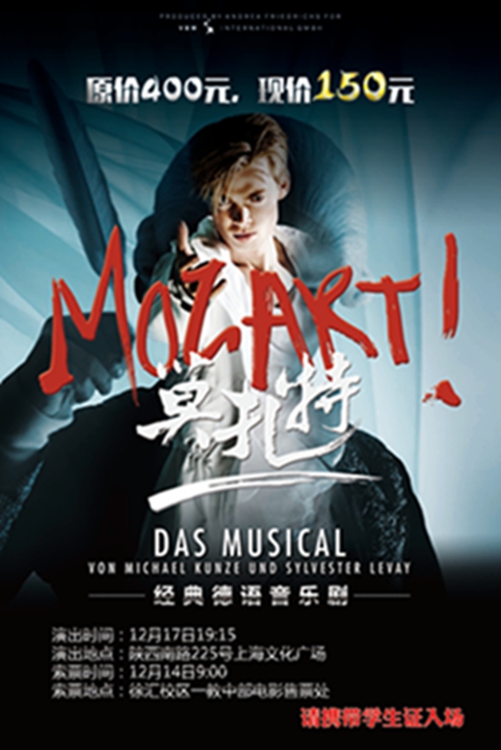 經典德語音樂劇《莫扎特》(中英文字幕)于12月13日登陸上海文化廣場。該劇1999年10月2日首演于維也納Theateran der Wien劇院,目前已在7國上演,全世界演出超過2000場,觀眾逾200萬人次,是一部經久不衰的國寶級劇目。制作方奧地利VBW公司是在歐洲最負盛名的音樂劇制作公司,他們的德語音樂劇在歐洲如雷貫耳,甚至比《劇院魅影》《悲慘世界》在歐洲的影響力更大!